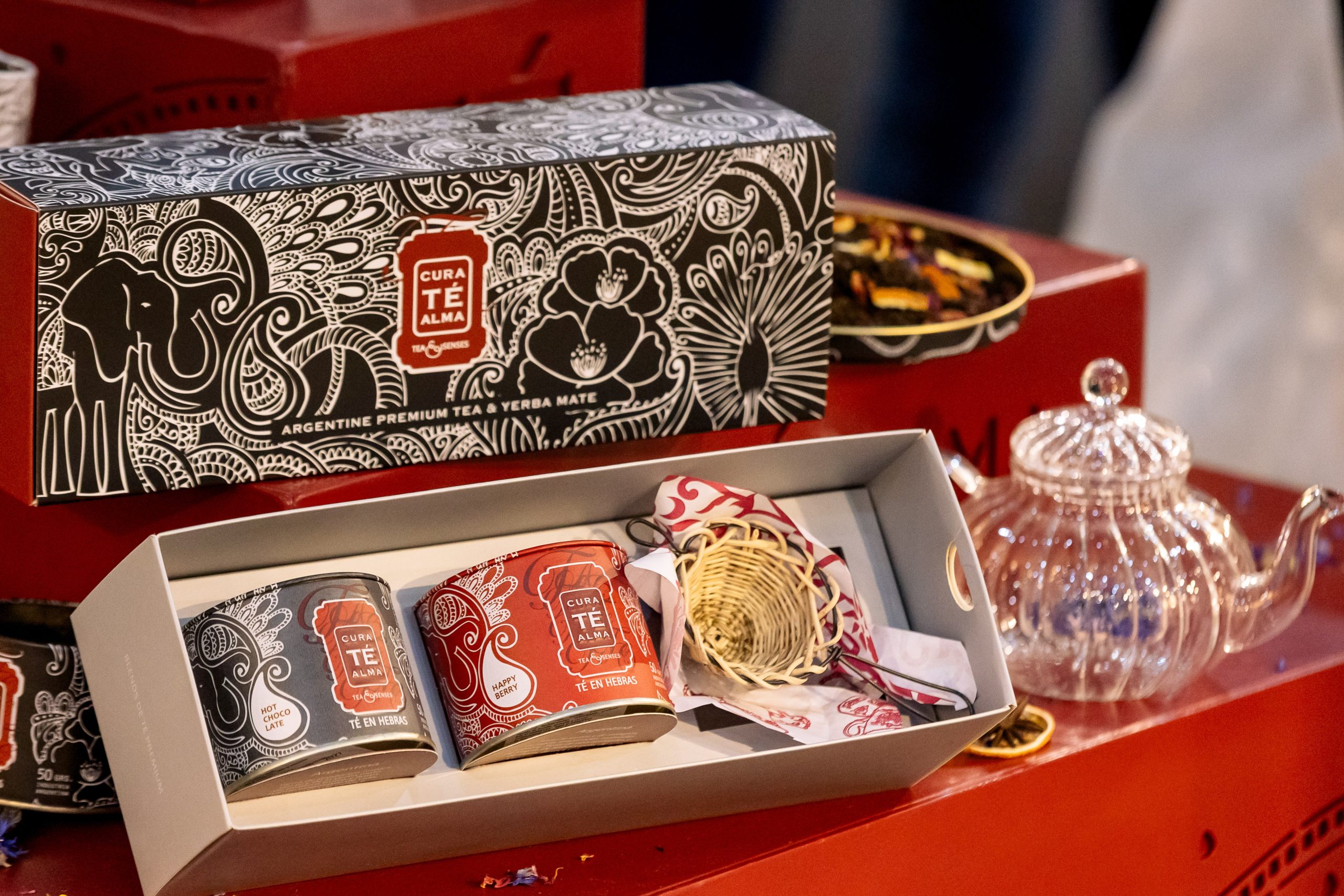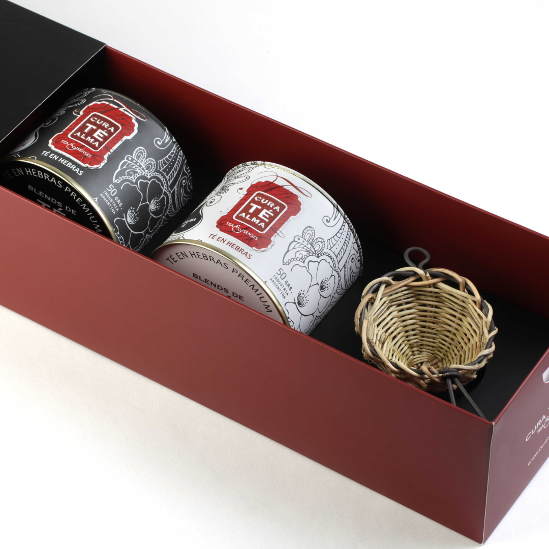Elegante Estuche de Regalo de Cura Té Alma con dos blends de té de 50 gramos cada uno y un colador de té.